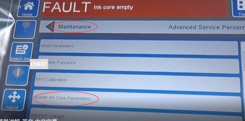 Следующее – обновить параметры ядра чернил, то есть, когда машина устанавливается в первый раз, все чернила и растворитель установлены, и необходимо один раз обновить параметры ядра чернил, и обновить их здесь, это объяснение меню: