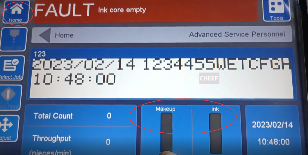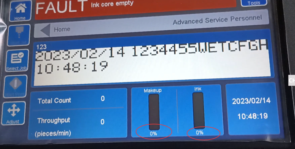 Это основная часть интерфейса, это процент использования растворителя, процент использования чернил, оба сейчас равны 0%, потому что растворитель чернил сейчас не установлен.: