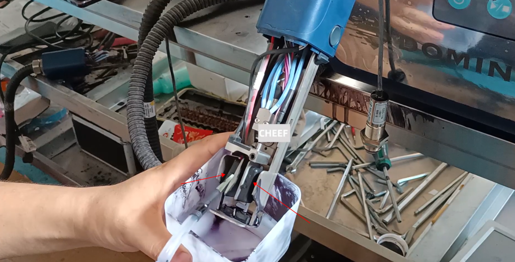 The first is the recovery failure, check whether the ink line is deviated, that is, whether the line ejected by the nozzle is crooked. If it’s not crooked, it means it’s blocked here. Spray cleaner on the nozzle side, rinse it, blow dry, then turn it on again.