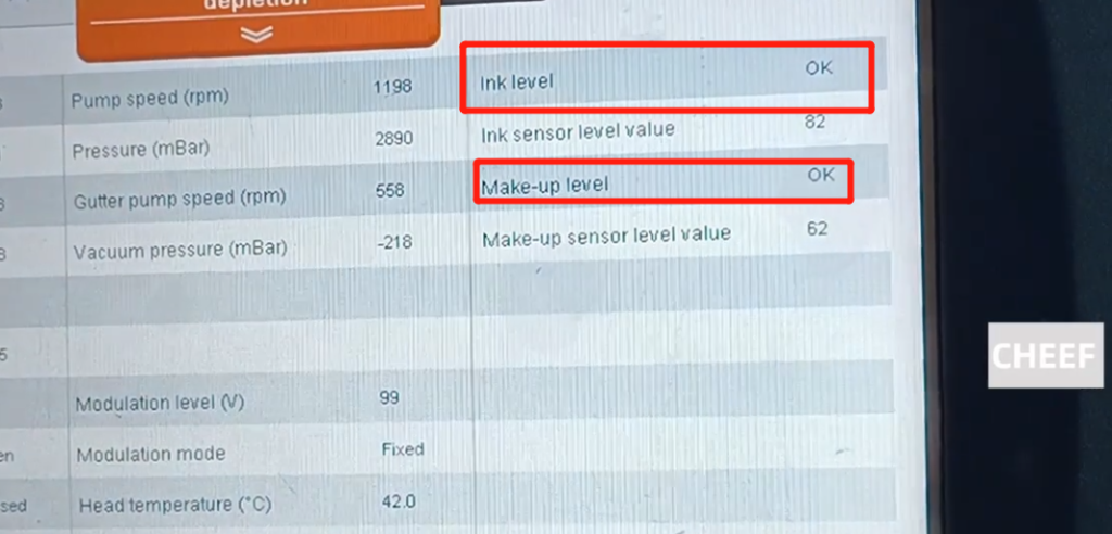 You can see all the parameters right here here. The ink level “OK”, the solvent level “OK”, you can see the relevant parameters.