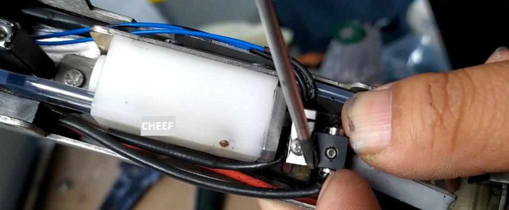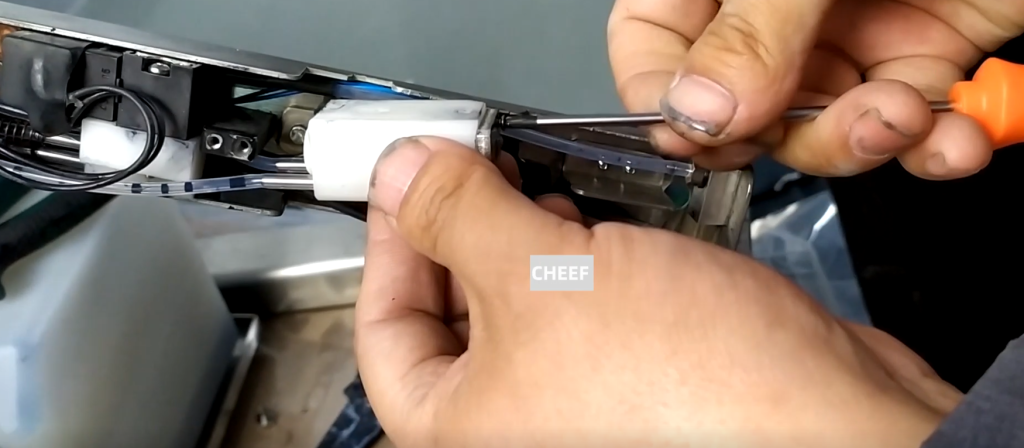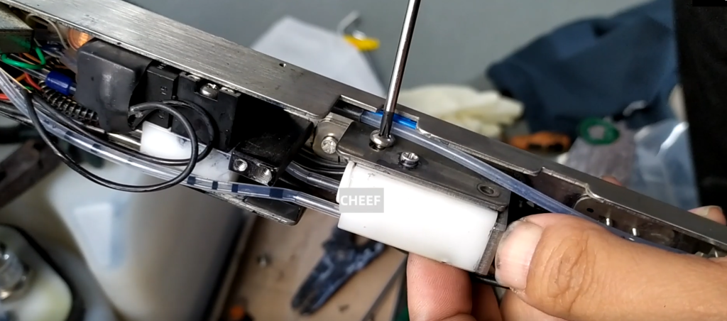 If we remove the nozzle, we need to take this off. Remove this screw and this screw.