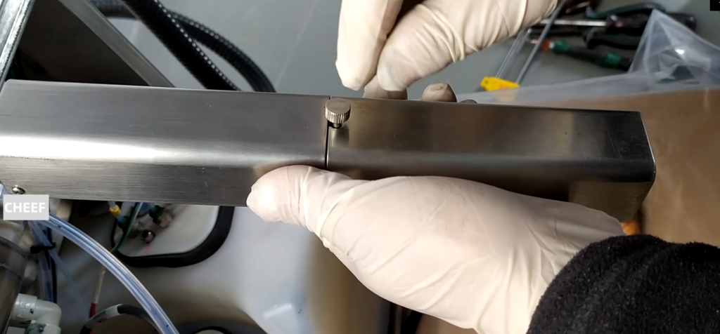 Then we take it off now and press it up. By loading, it’s simpler, we turn it over, there is a hole behind it, just align it. We align the holes here, and then we align them. We will install the second screw again. This high-pressure deflection plate is installed.