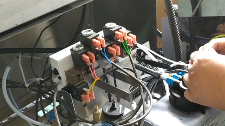 After installing the six valves, put the coils on the valves in order to cover, and then secure the fixed screws of the coils:Then we’ll just plug this blue return tube in:Then install the wire and tighten it:Then install the red tube:Insert the green tube into this hole:Then install the plug, tighten it slightly so that it doesn’t leak ink:Then plug this thick tube in: