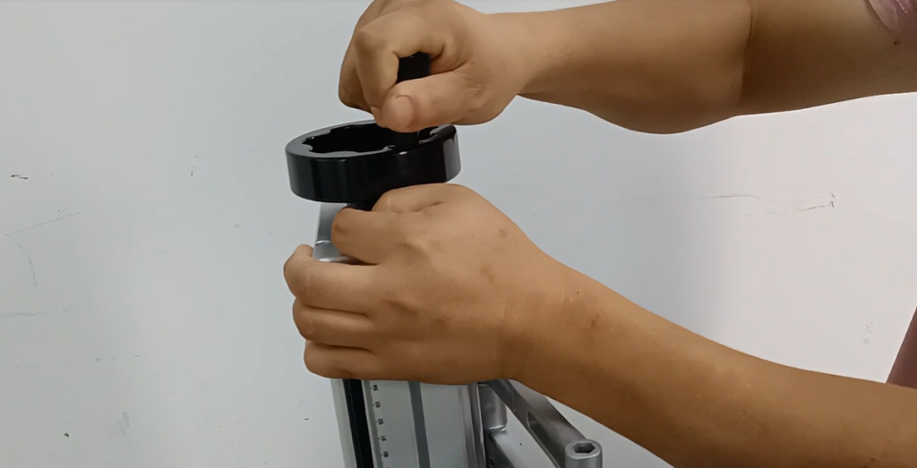 The best focal length we changed by moving our slide. It’s the column, and then the two points overlap, to our best focal length. These two points overlap is our best focal length. We set it in the focal position.
