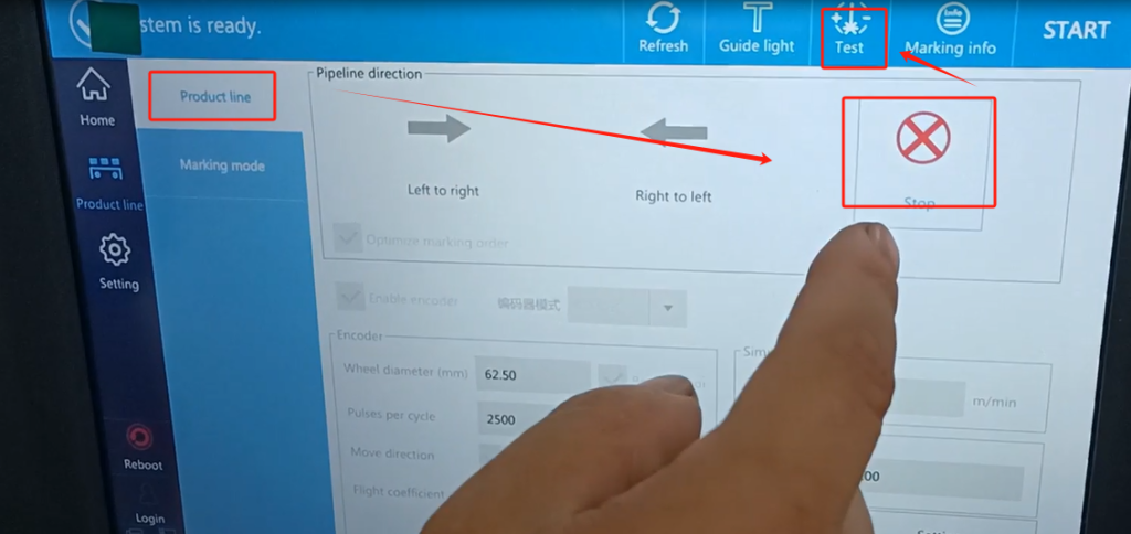 We’re going to stop it, and then look at the next one on the line speed side and reduce this 60 a little bit and turn it to 40. And then let’s print it out again. We’ll turn the machine on again, and then we put the product below.