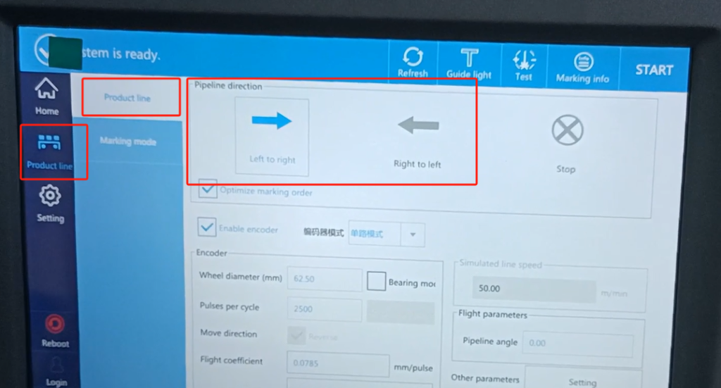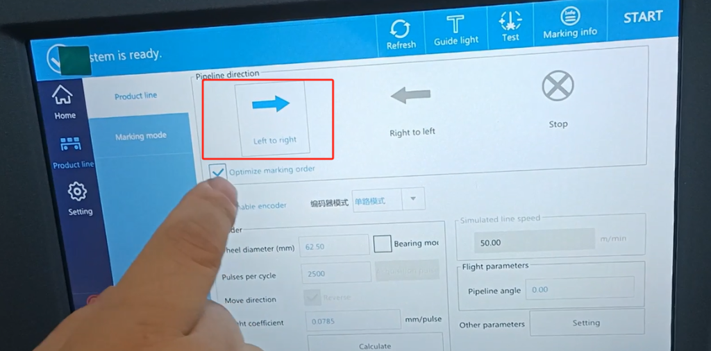 For printing, let’s look at how the flight printing marks. First, we need to create a message. How to create it? We’ve already talked about it before, and we’ve already said it on the video, so we don’t care. And then we say how to fly. We have a production line here for the flight mark. If we look at the production line, we have a model that puts the product down to print. That means a single product is printed once. What direction do we use in this case? That is to see the direction of our product movement, whether it moves from left to right or from right to left. If we move from left to right, we choose this; if we choose this from right to left, this is according to one of our field needs.