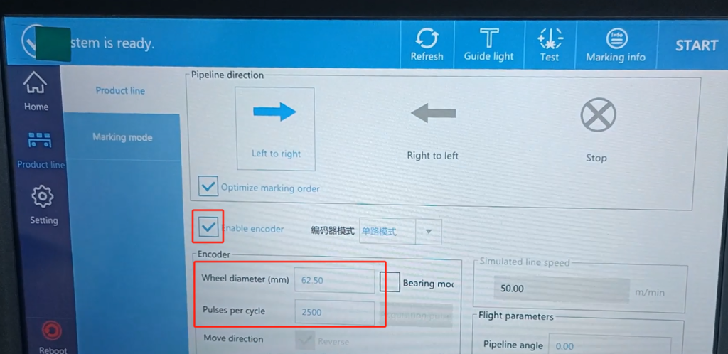And that means we adjust this, and then we have to adjust the parameters. Then if we want the flight mode, we have to enable the encoder. Then we have this wheel in diameter. We want to measure the wheel diameter of the encoder, the value of the quantity is in. This, of course, we all set the factory. If we use the original encoder, we have all set it up, so we don’t need to move. And then the pulse 2,500, which is the pulse 2,500 of our encoder. After we set it here, we don’t move it after setting it. Of course, if we receive the machine, and then it is set, we don’t move it.