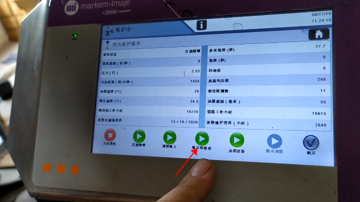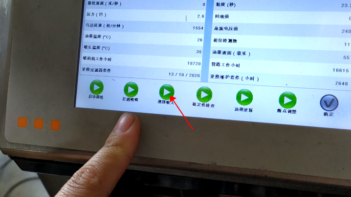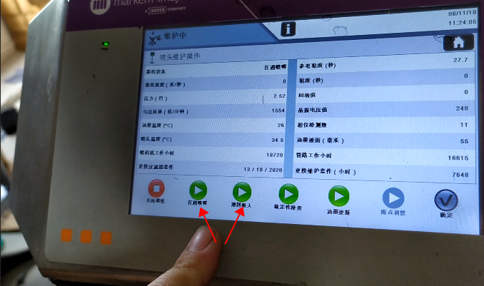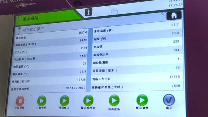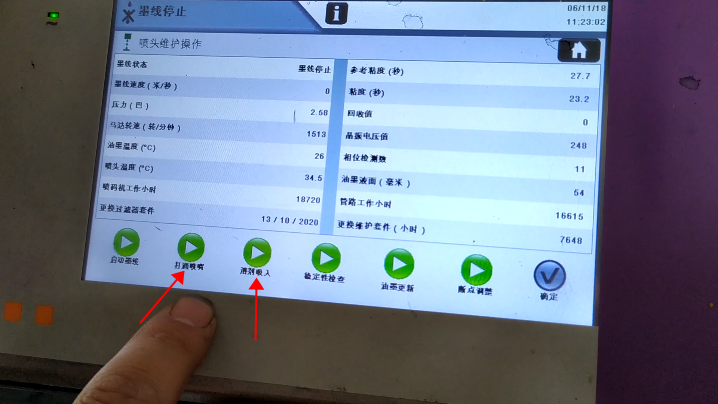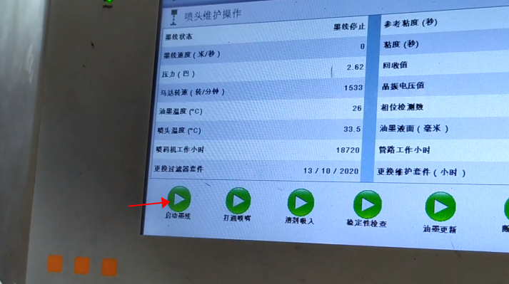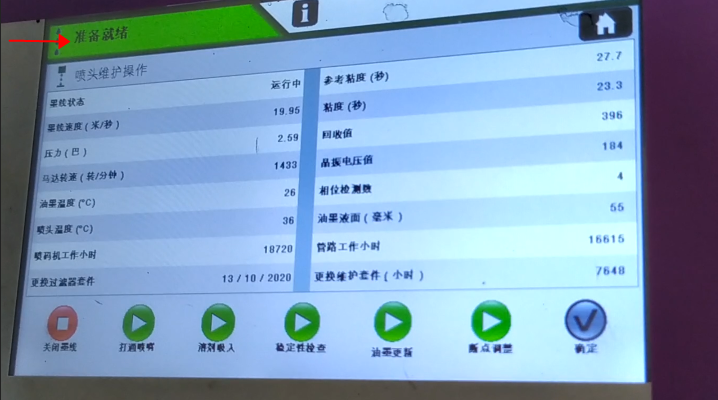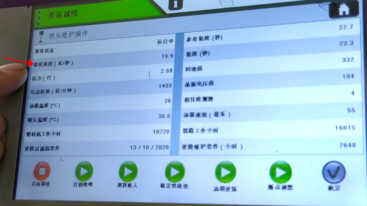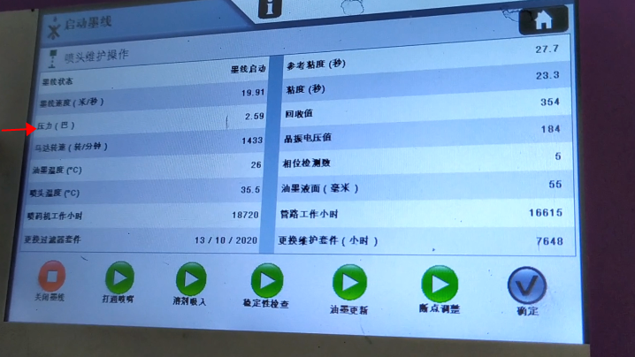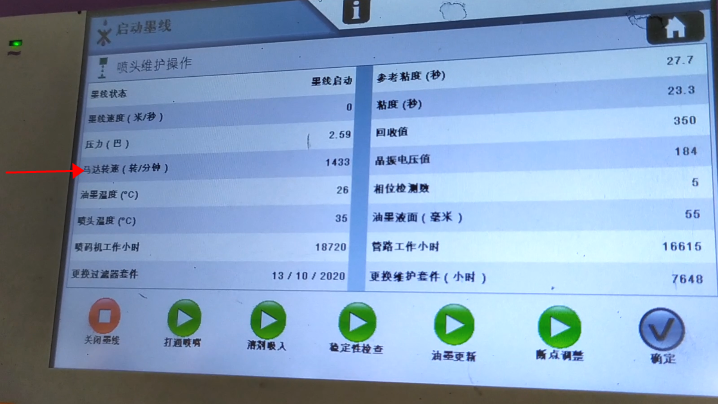 After blow-drying, we click “Start Ink Line”:Then, we heard the sound of recycling, indicating that the ink line has been opened:Observe whether the position of ink line is in the middle of the recovery tank. This is not possible to adjust its position. It is fixed. If the ink line is not hit the recovery tank, the ink line is biased, there must be only one result, that is, our nozzle is blocked:In general, the motor speed is generally below 3000, in 1500, 1600 or 2000 or so is the best:Then, the pressure must be less than 3:Our ink speed is around 19.9:And then in this state it’s okay:And then the green light “Ready”:Now it means that our machine is all right.