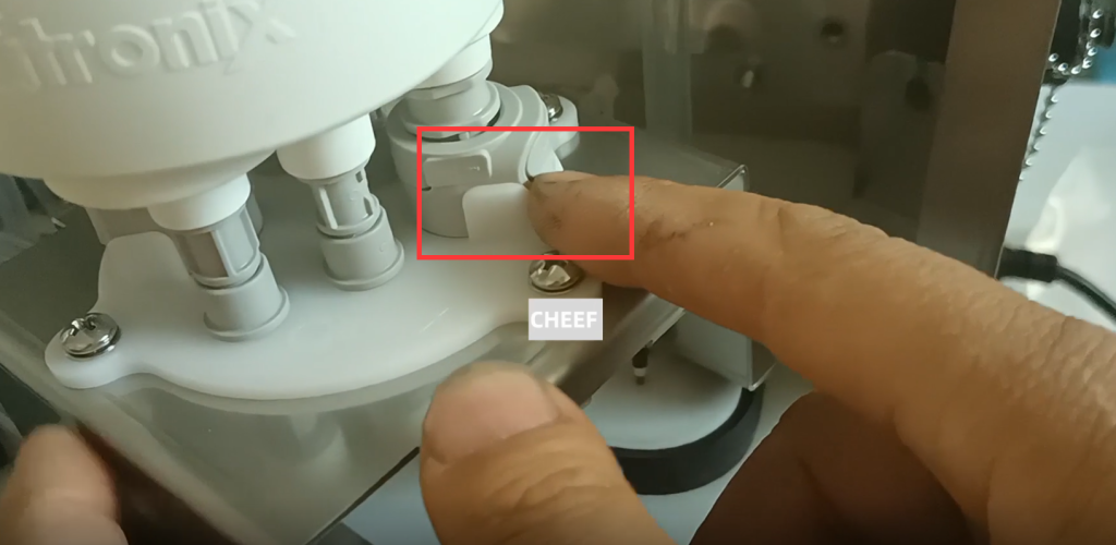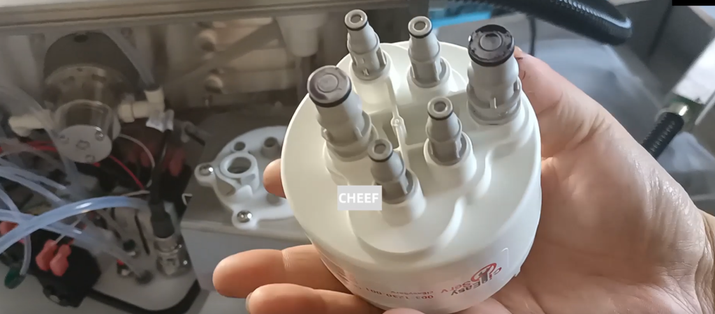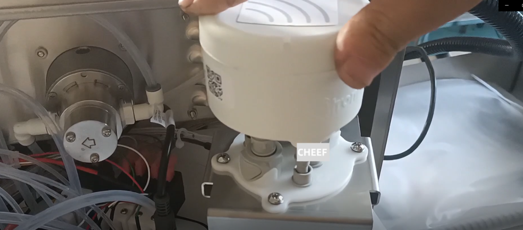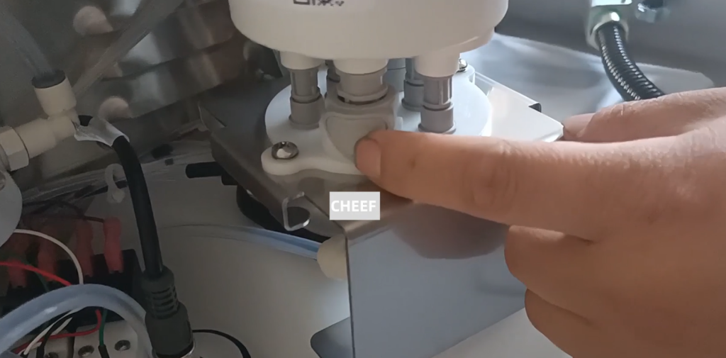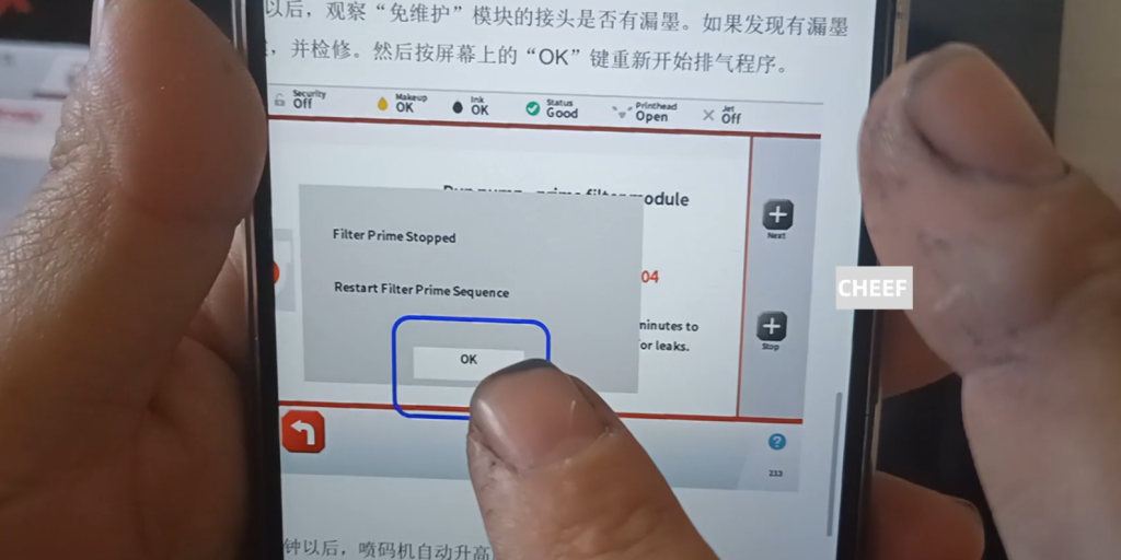 Now let’s look at how the main filter is removed. Then we remove the machine, remove the filter, our machine ink line must stop, the ink pump must stop turning, that is, the ink line state is closed. There is a push button here: