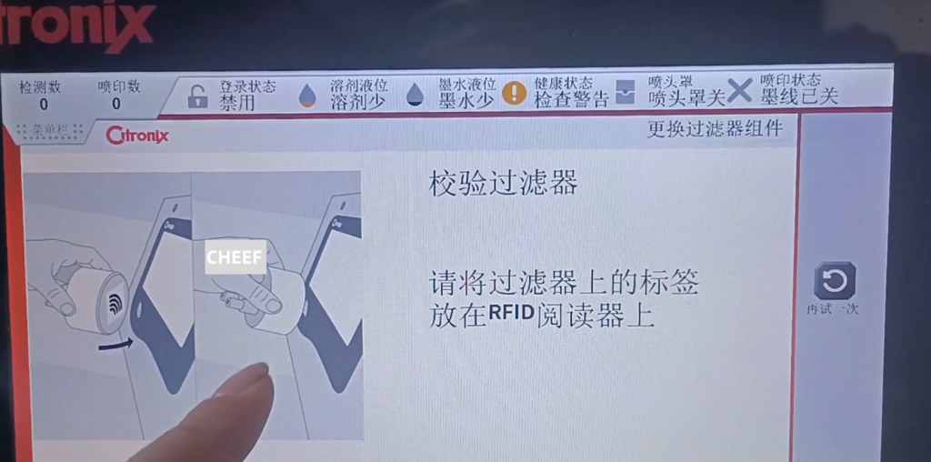 This label should be brushed against this position. After a swipe, it prompts you for the next step. According to our next step, and then to replace our filter. According to how the above prompts, how do we operate.