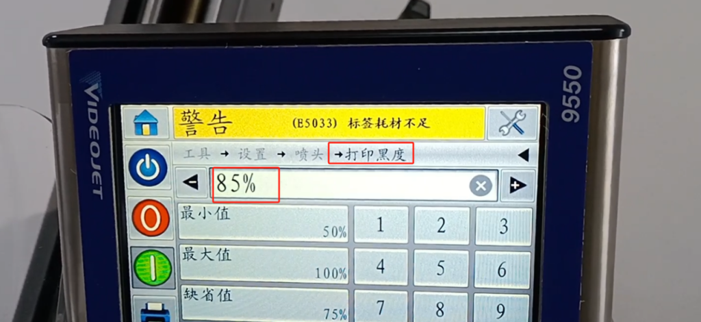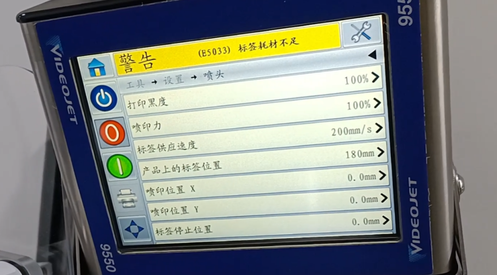 Most of our adjustments are done here. Firstly, the default grayscale for printing is 100%. We can adjust it, and if the color feels too dark, we can lighten it a bit. The default now is 100%, which refers to the printing force, just like the force we stamp. This can also be adjusted, usually around 80, 90, or 100. The supply speed of the labels is consistent with the speed of our label operation and the speed of our input tape. It is best for its operating speed to be consistent, that is, as close as possible. And then the position of the label on the product, this position is the delay, which is the delay printed on the product. We can change its parameters according to our needs, and then paste it on our product at a position before and after it.