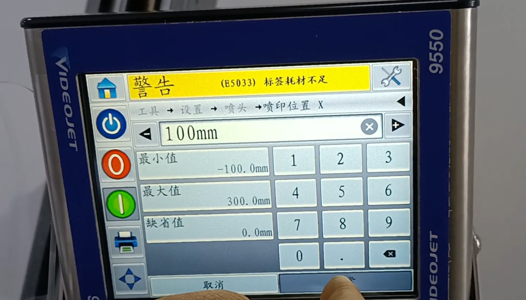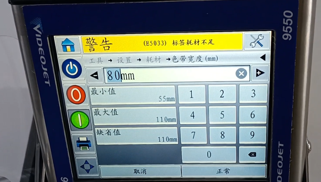 Set up the consumables inside, and then set up the width, we have to enter 80. Set it according to the width of our ribbon. The width is 55, the maximum is 110 between the ribbon can be used. Since we have a 107 print head, it can be 55-110。