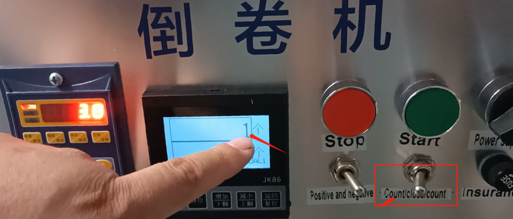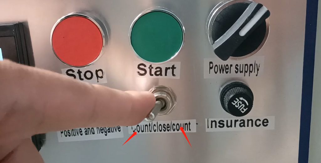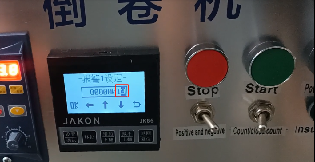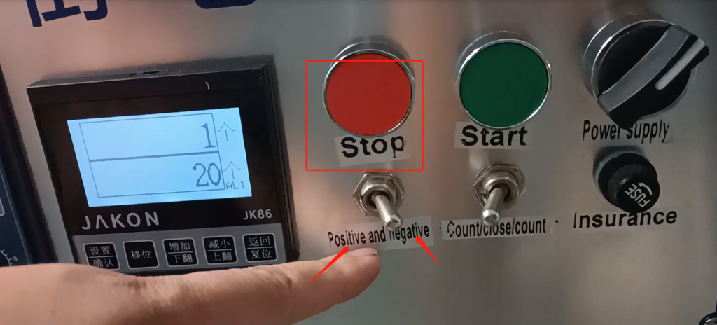 We have meter and count down here, so we’re going to go up here, which means we’re going to press this shift.Now we’re setting alarm 1. What does that mean.For example, if we want to set 20 to stop, we set the alarm 1 to 15 or 12, the two values are close, not greater than the number of alarm 2.Alarm 2 is the value we set 20 to stop, we need to change alarm 2 to he 20.If the alarm 1 value is set to 13, the machine will start to slow down at 13, and stop until the machine turns to 20 after slowing down.Then alarm 1 is less than 20.And once we set it up, we can press this down arrow key and this up arrow key, and we can go up or down.You can also move it by this shift, move it this way or move it this way.
