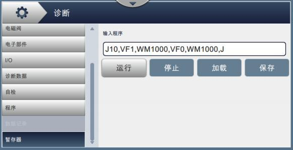 Manually edit the staging run code to switch and test each solenoid individually. The specific method is to enter the switch operation code of the solenoid in the “temporary memory” of the “diagnosis” menu, as shown in the figure below, “J10, VF1, WM1000, VF0, WM1000, J”, the code means that the VF valve switches 10 times, and the holding time is 1 second, the “VF” in the following code to other solenoid code for switch test