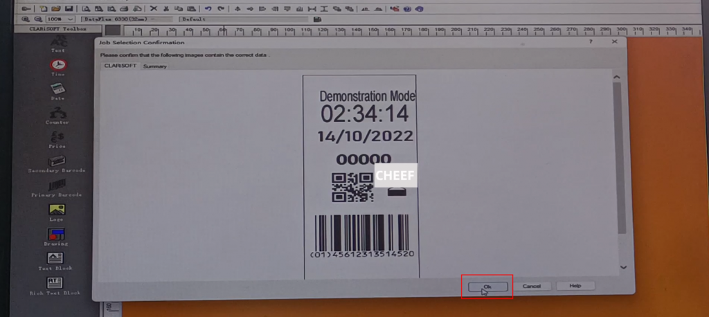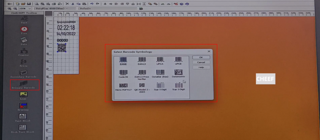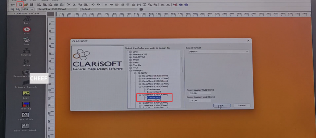 We create a new 6330 machine information, click this newly built, choose under this Videojet. there are models that can be selected here, 6330, according to the model selection needs, now choose a printed head with a width of 32 mm, choose continuous continuous continuous Just click OK directly: