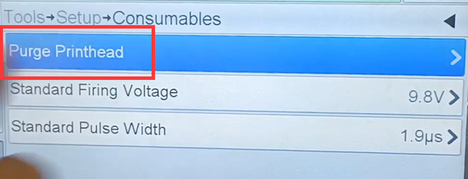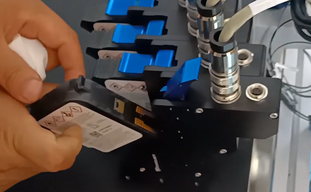Click on Supplies.Then place a clean cloth or a piece of paper underneath.Click to clean the nozzle and confirm.This is what it looks like after cleaning.If it is still not good after cleaning, then turn off the machine. First click the red Run button, then click the blue Shutdown button.After shutting down, press the switch.Then take out the ink cartridge, and you can see which ink cartridge prints poorly. Through the printing quality and the printed products, it can be seen which of the four ink cartridges has a poor printing effect.Assuming that the printing effect of the 4th ink cartridge is not good, take out the 4th ink cartridge, wipe it (there is an explanation on how to wipe it), and then put it back gently after wiping, and cover it.