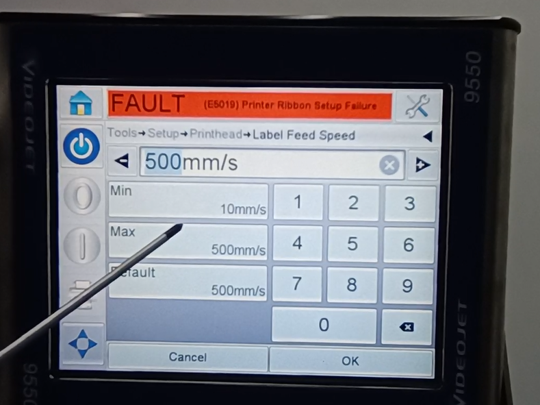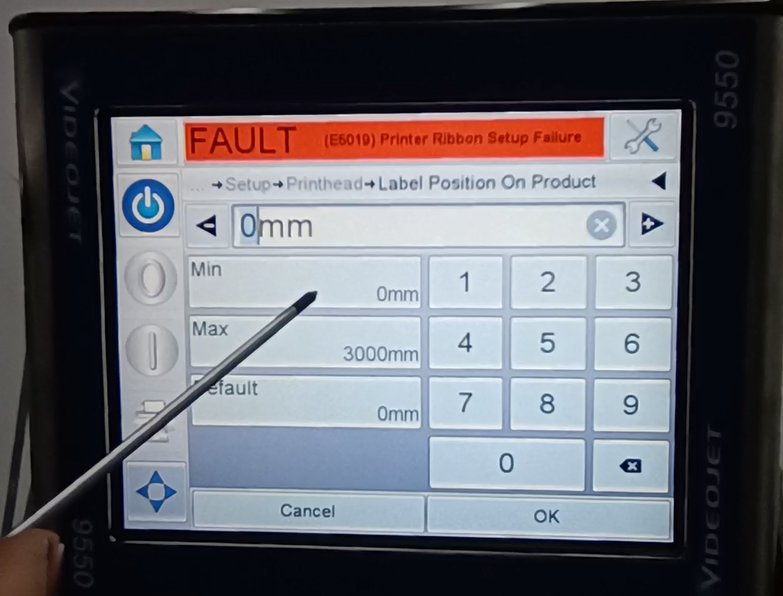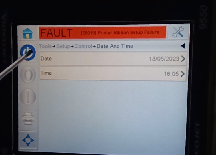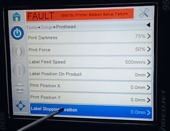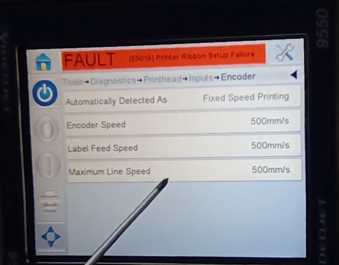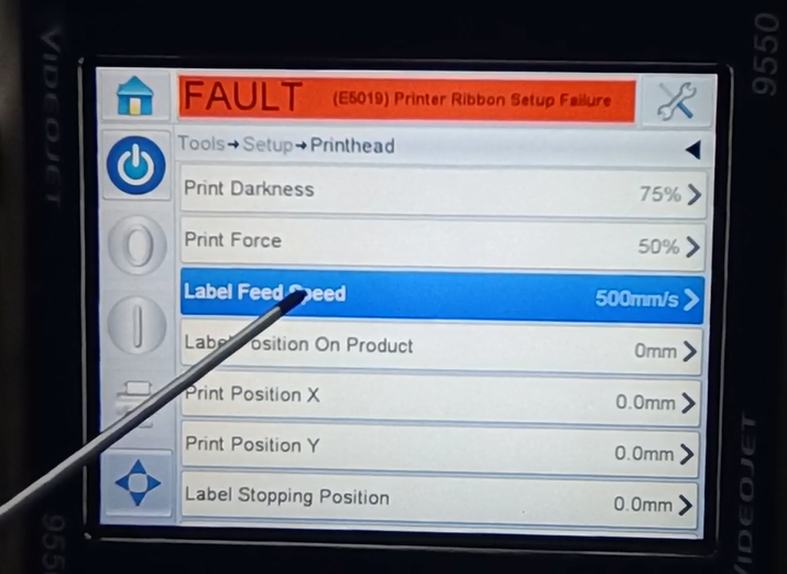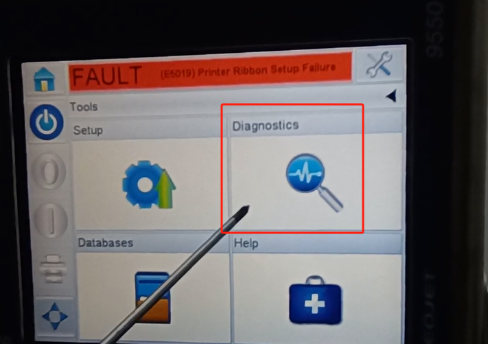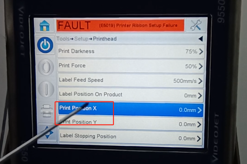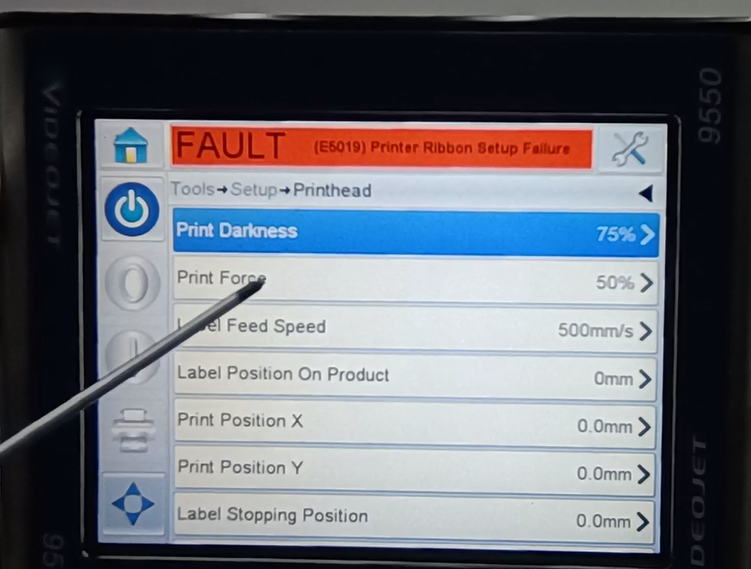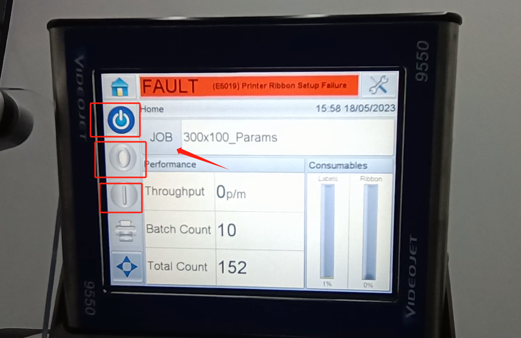 Let’s take a look at the vidit 9550 sticker machine on its menu. Let’s take a look at this main page. This side can see the fault bar. You can see a main menu with this button, and a run button switch. Then run then offline button these three. You can see a message from here.