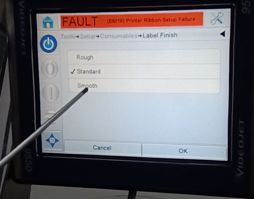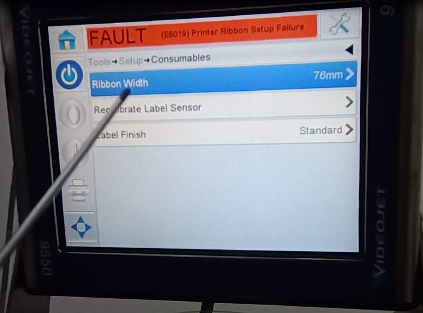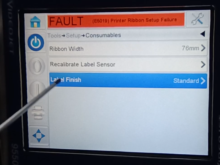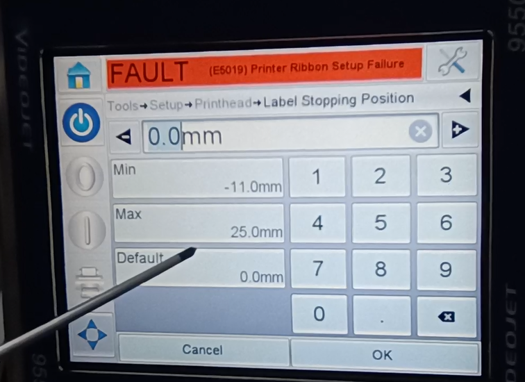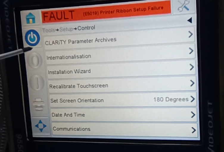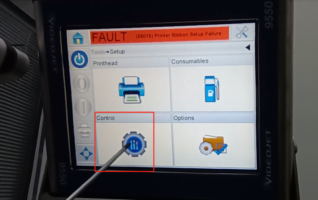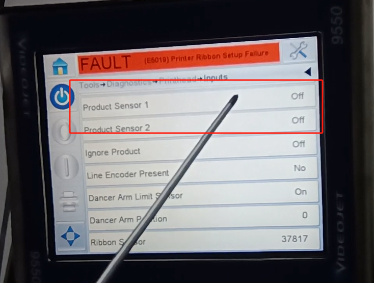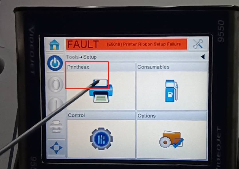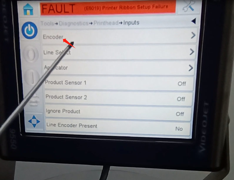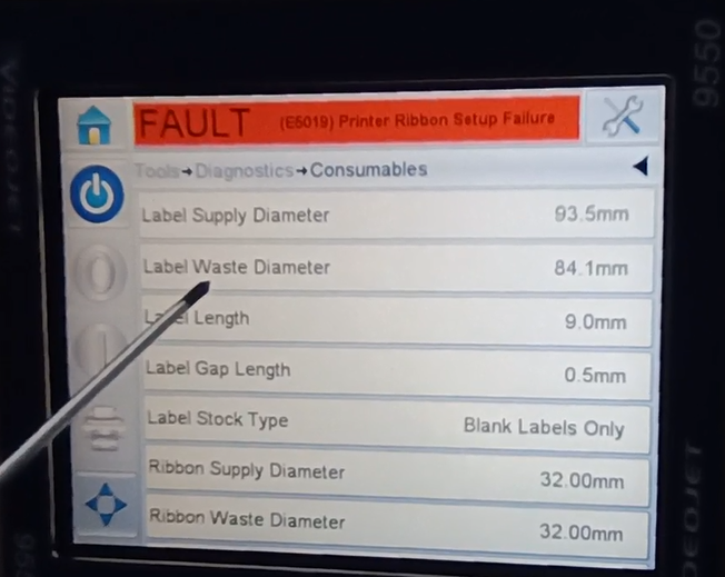 Let’s take a look at the vidit 9550 sticker machine on its menu. Let’s take a look at this main page. This side can see the fault bar. You can see a main menu with this button, and a run button switch. Then run then offline button these three. You can see a message from here.