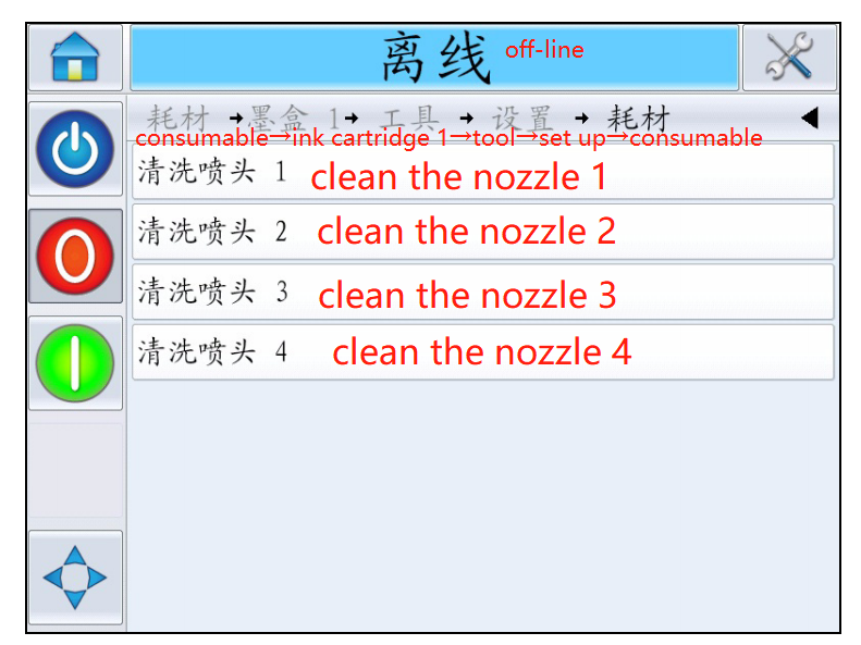 - On the “Consumable ” screen, touch the desired nozzle. For example, if you want to wash the first nozzle, touch “Wash nozzle 1.”