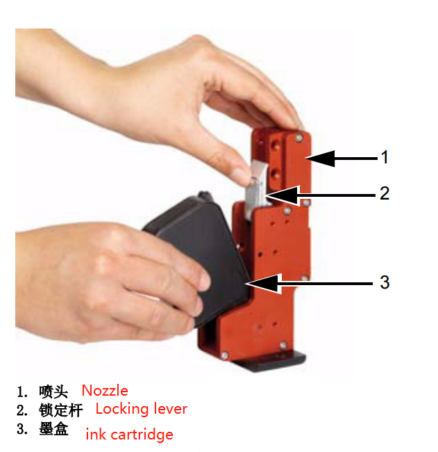 6. Press down the lock bar to tighten the cartridge to the nozzle.